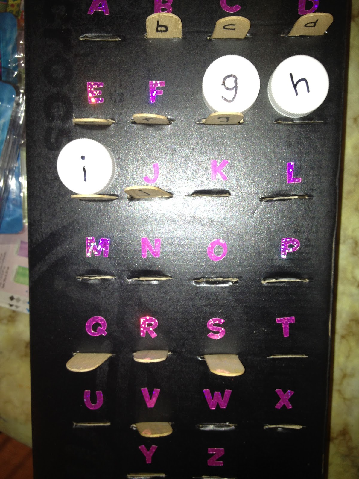 This project couldn't be simpler (or inexpensive) to make. Spray paint an adult-sized shoebox (I only had black spray paint on hand). While that's drying, I printed lowercase letters on wooden craft sticks. Once the box is completely dry, using an exacto knife make evenly spaced slits into the top of the cardboard box (making sure your craft stick fits easily inside the slit). Lastly, place scrapbook letter stickers above each corresponding slit. That's it. Bonus- the pieces fit neatly inside the box.