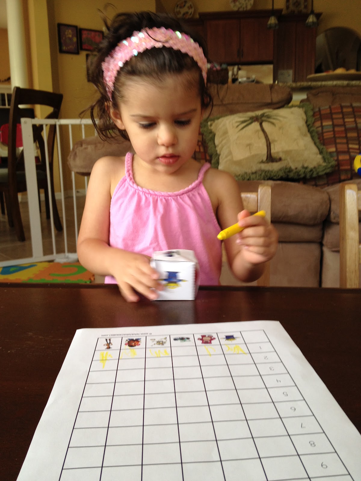Now we move onto the graphing portion. Little Miss didn't think it was fair that Buzz had two squares colored when Jessie only had one, so she kept rolling the die until she landed on Jessie. How cute is she?